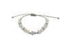 Pulsera ajustable de cruz con circonias, perlas cultivadas y rondeles de brillos plateados. Su diseño ajustable con hilo resistente permite un calce cómodo y seguro, ideal para todo tipo de muñeca.